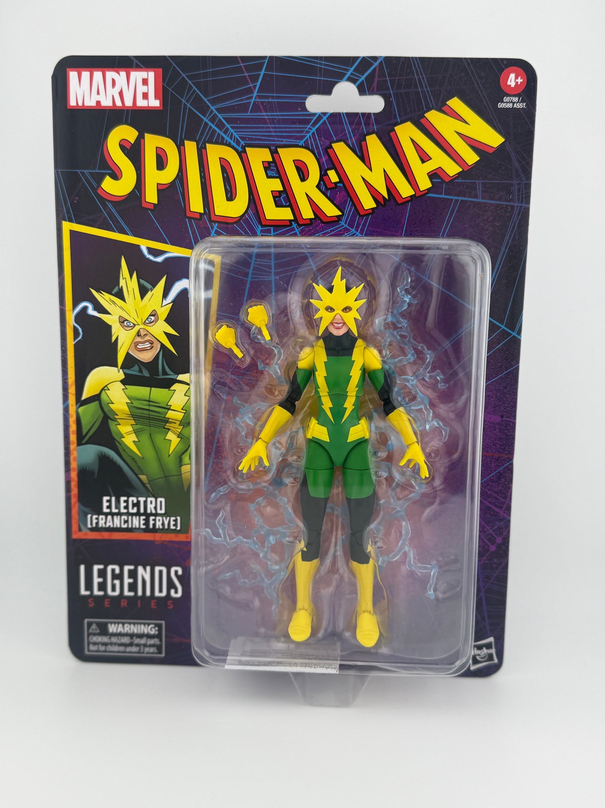 When Francine Frye absorbs the powers of Electro, she uses the ability to manipulate electricity to transform from accomplice to Super Villain. Bring the excitement and wonder of the Marvel Universe to your collection with Hasbro Marvel Legends Electro (Francine Frye) figure! This collectible 6-inch scale Marvel figure is detailed to look like the character from Marvel's Spider-Man comics. This Electro action figure is fully articulated with premium design and poseable head, arms, and legs. Marvel action figure set comes with 4 accessories, including an alternate set of hands and attachable power FX. Hasbro Marvel action figures' 6-inch scale make them great for posing and displaying in fans' collections. Reimagine comics-inspired scenes on your shelf with Marvel Legends action figures and Marvel collectibles. Ages 4 and up.