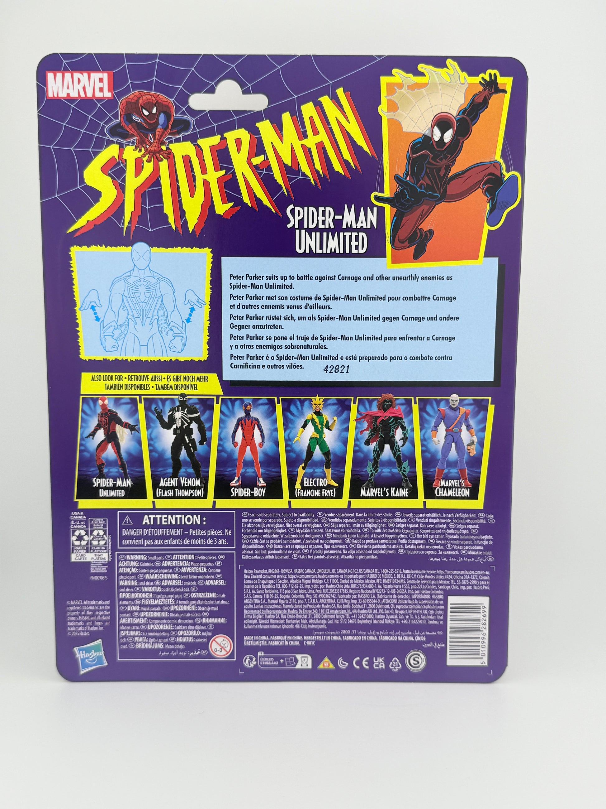 Peter Parker suits up to battle against Carnage and other unearthly enemies as Spider-Man Unlimited. Bring the excitement and wonder of the Marvel Universe to your collection with Hasbro Marvel Legends Spider-Man Unlimited figure! This collectible 6-inch scale Marvel figure is detailed to look like the character from Marvel's Spider-Man comics. This Spider-Man action figure is fully articulated with premium design and poseable head, arms, and legs. Marvel action figure set comes with 4 alternate hand accessories. Hasbro Marvel action figures' 6 inch scale make them great for posing and displaying in fans' collections. Reimagine comics-inspired scenes on your shelf with Marvel Legends action figures and Marvel collectibles. Ages 4 and up.