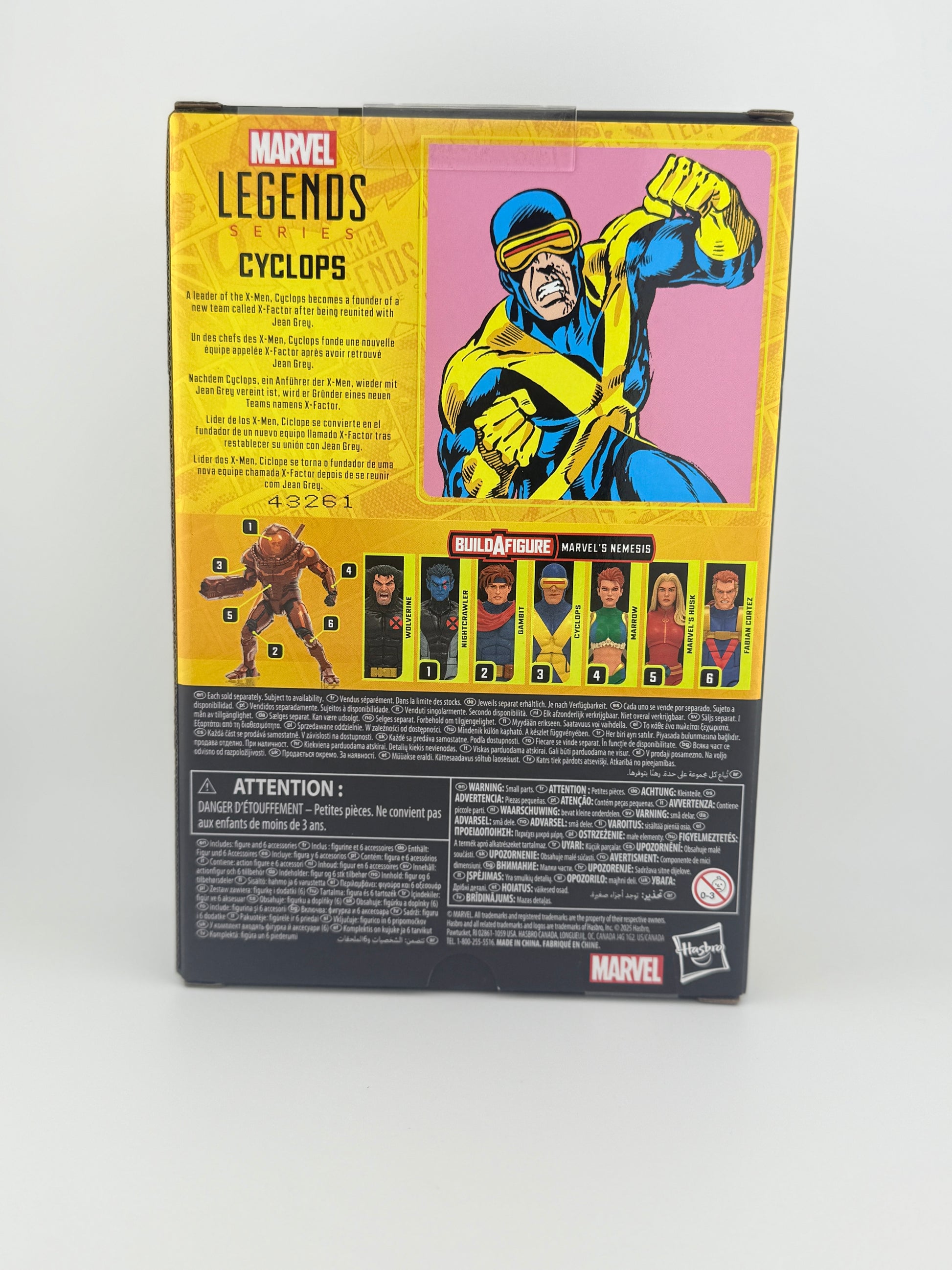 Bring the excitement and wonder of the Marvel Universe to your collection with Hasbro Marvel Legends Cyclops X-Men figure! This collectible 6-inch scale Marvel figure is detailed to look like the character from Marvel's X-Factor comics. Cyclops action figure is fully articulated with premium design and poseable head, arms, and legs. Marvel action figure set comes with 5 accessories and 1 Marvel's Nemesis Build-A-Figure piece. Complete the additional figure with Marvel Legends X-Men action figures Nightcrawler, Gambit, Marrow, Marvel's Husk, and Fabian Cortez. (Each sold separately. Subject to availability.) Hasbro Marvel action figures' 6 inch scale make them great for posing and displaying in fans' collections. Reimagine X-Men comics-inspired scenes on your shelf with Marvel Legends action figures and Marvel collectibles. Ages 4 and up.